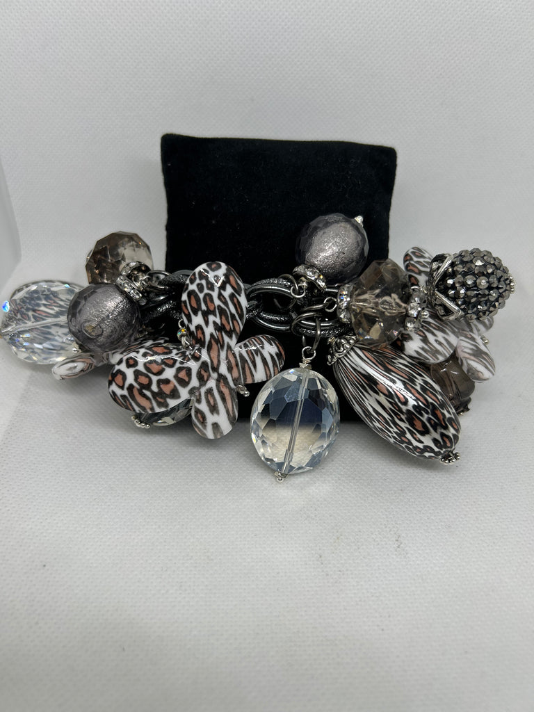 This statement charm bracelet will make a bold statement. Designed by Sandra Ling Designs it features an eclectic mix of oversized beads, and mixes earthy browns, smoky crystal accents, leopard print designs, and baubles,