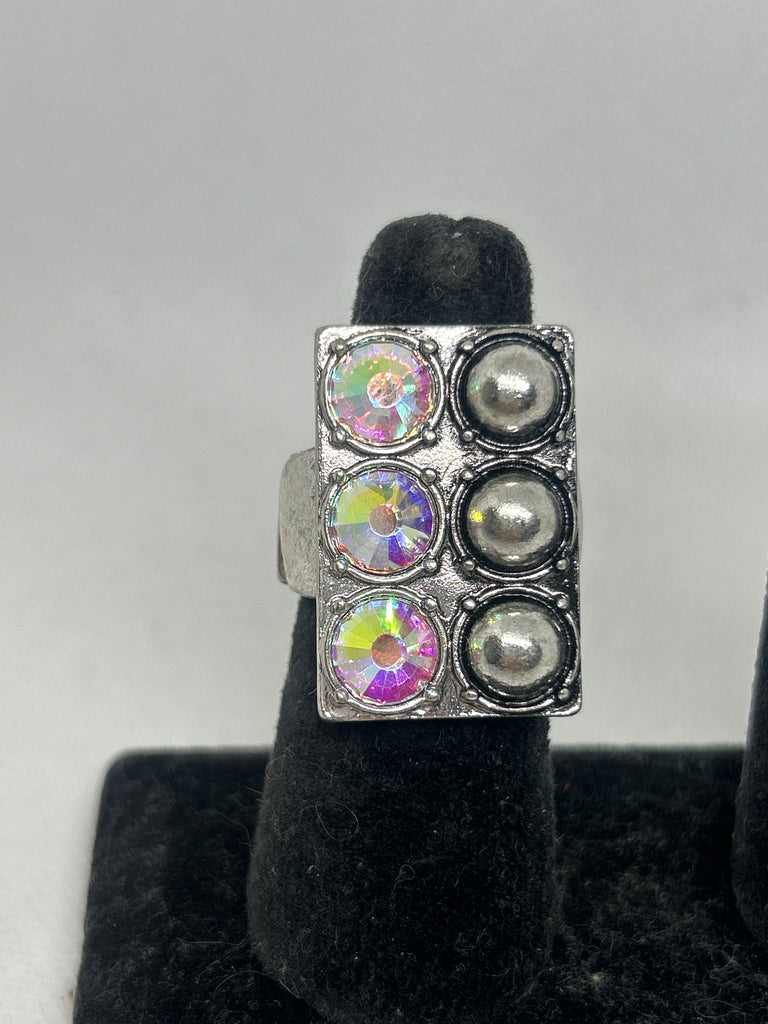 Add bold sparkle to your look with our Crystal & Silver Dome Stretch Ring. The eye catching statement ring features a modern rectangular design with a striking mix of iridescent crystal stones and polished silver dome accents.
