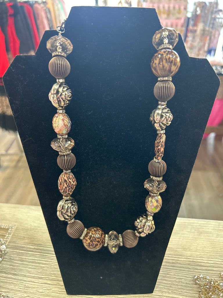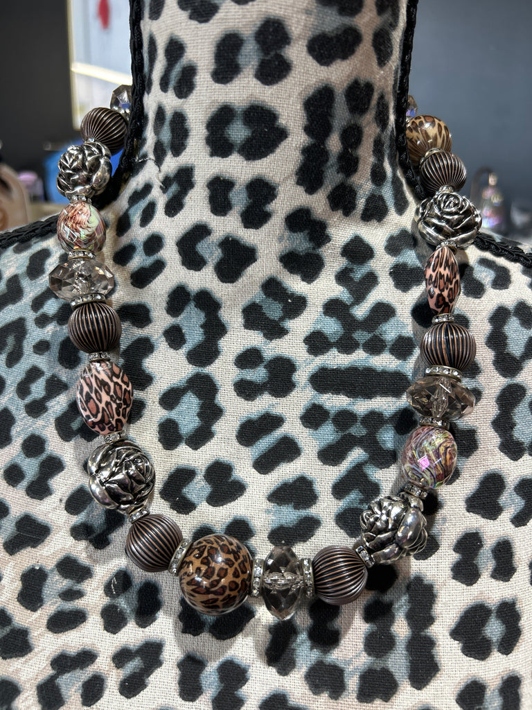 Make a bold, artful statement with this handcrafted necklace by Sandra Ling Designs. Featuring an eclectic mix of oversized beads, this piece mixes earthy browns, smoky crystal accents, Leopard Print Details, ribbed matte beads, and iredescent floral rosettes.