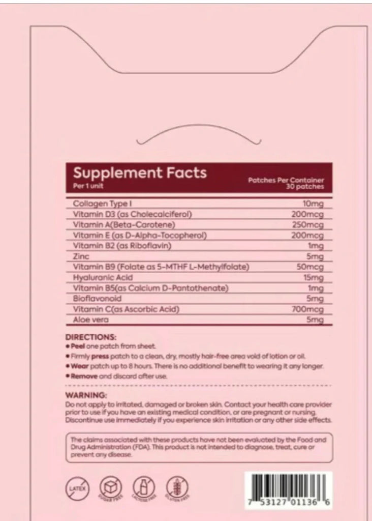 These patches deliver essential nutrients directly through the skin, offering a convenient alternative to oral supplements, Collagen supports skin structure and help reduce the appearance of fine lines.