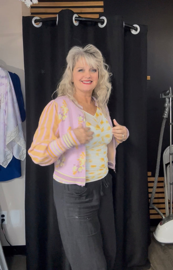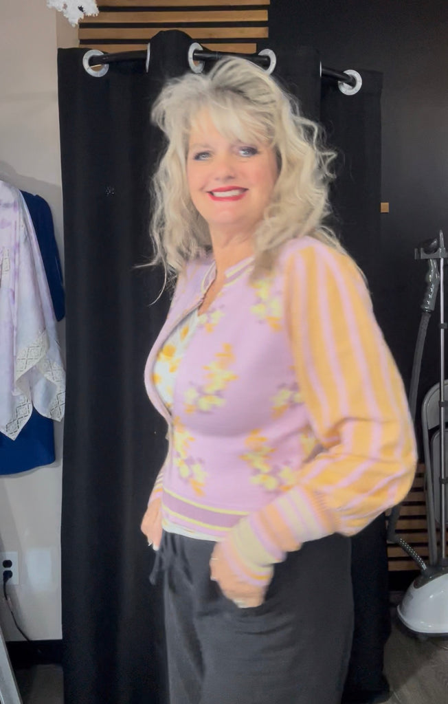 The Contrast Striped Sleeves and delicate floral Pattern create a unique, eye catching look that pairs effortlessly with denim, pants, or skirts.