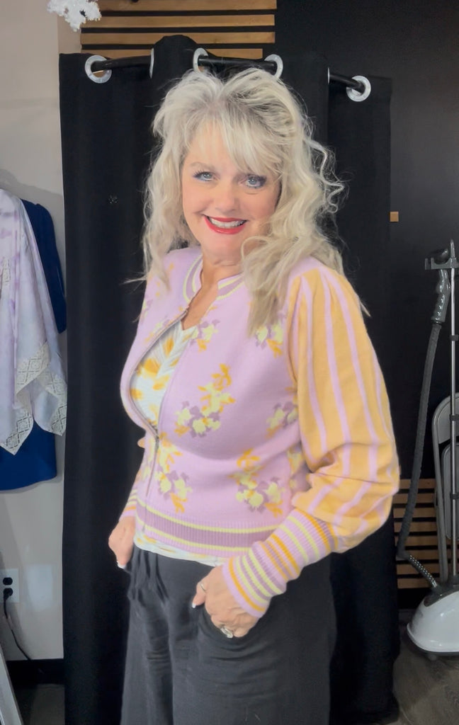 Add a playful pop of color to your wardrobe with this charming floral bomber knit Cardigan. Featuring a soft knit feel and a flattering silhouette this piece combines feminine florals with sporty bomber inspired details.