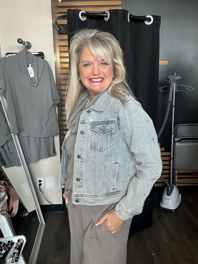 Turn heads and own the spotlight in this Rhinestone Denim Jacket
