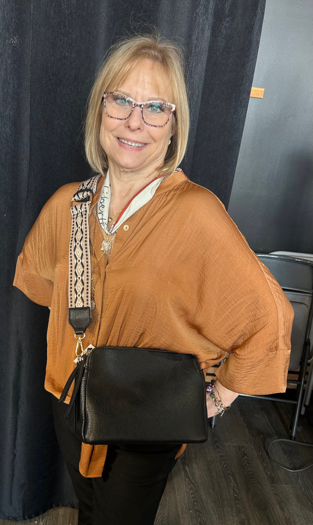Looking for a hands free Crossbody Purse in Black? This faux leather purse has three compartments which make it so easy to separate your cell phone, money, and other items. This one provides both fashion and function.